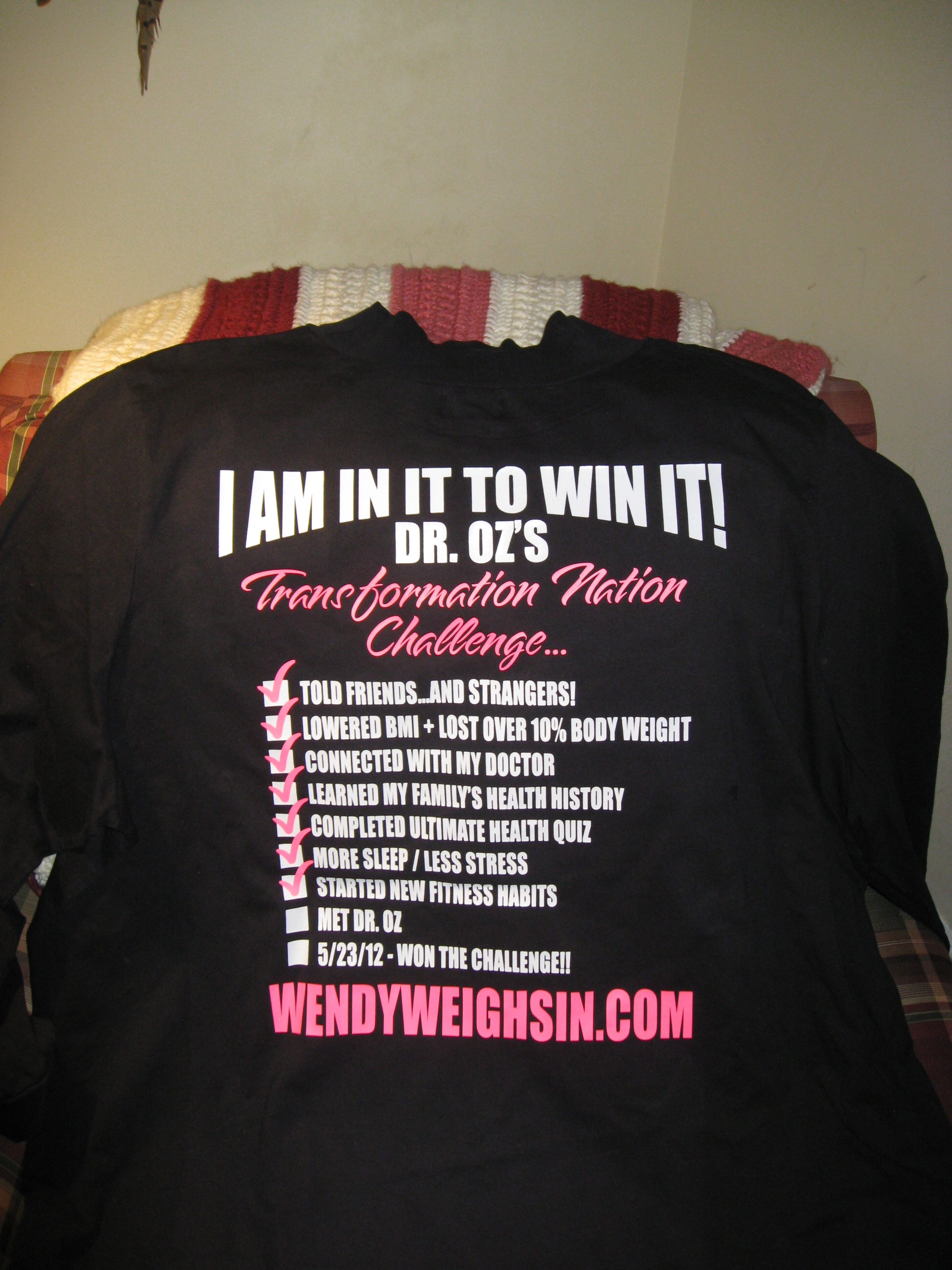 As I type this, there are 2 weeks left until my final weigh in of this Transformation Nation Challenge. I remember, in October, watching Dr. Oz announce the challenge, and I literally sat up from laying down on the couch, and I sat on the edge of the couch with my notebook, and started to write down everything he was saying, and an overwhelming feeling came over me that it was time to do this, and an incredible belief came over me, feeling that..not only could I do this, but I truly believed that I could win the entire challenge.