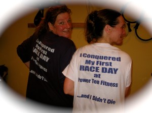 On Wednesday night, Meg and I picked up shirts we had made, to put on after we completed the race. On the back it said, “ I conquered my first Race Day at Power Ten Fitness (and underneath it said in smaller letters)……and I didn’t die” On the front pocket area it said, “There’s no place like home..Power Ten Fitness.” We couldn’t wait to put them on after the race and wear them proudly.